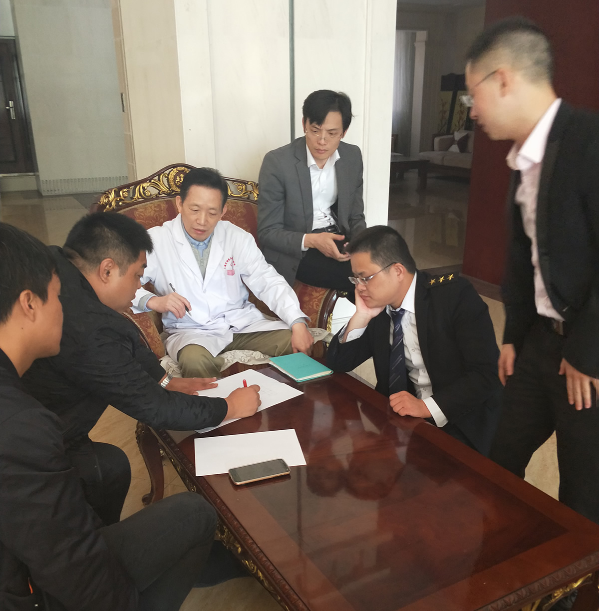 文峰國際負(fù)責(zé)人拿出建筑圖紙,與醫(yī)匠設(shè)計(jì)師進(jìn)行面對面溝通,醫(yī)匠設(shè)計(jì)師結(jié)合現(xiàn)場情況和圖紙,與甲方就室內(nèi)設(shè)計(jì)進(jìn)行熱烈的討論。