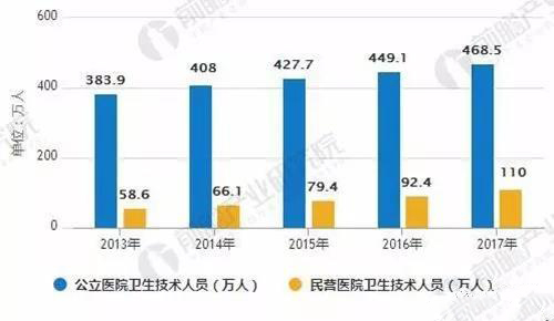 2017年末中國醫(yī)院衛(wèi)生技術人員578.5萬人,公立醫(yī)院衛(wèi)生技術人員468.5萬人,比上年增加19.4萬人,占比81.0%。民營醫(yī)院衛(wèi)生技術人員110.0萬人,比上年增加17.6萬人,占19.0%。目前,公立醫(yī)院優(yōu)秀醫(yī)療人才依舊不愿到民營醫(yī)院從業(yè),民營醫(yī)院面臨人才短缺問題。