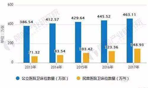 2017年末,全國醫(yī)院床位612.0萬張,比上年增加43.1萬張。其中,公立醫(yī)院床位4631146張,比上年增加175908張,床位占75.7%。民營醫(yī)院床位1489338張,比上年增加255701張,占24.3%。